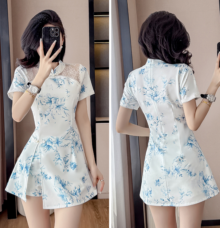 Blue Blossom Lace Dual Set 蓝色印花蕾丝中式2件套